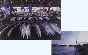 生まぐろの水揚げでは、日本屈指の漁港。早朝、仲買人が尾の肉を手かぎで見て品定めをしている。12月から6月までで、200キロを超える巨体が並ぶ。見学自由。