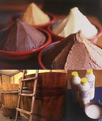 大正時代の創業時から使ってきた30石入り杉樽が仕込み蔵に並ぶ。麹(こうじ)から自家製。2月、仕込みに使う寒の水は、38メートル地下からくみ上げる吉野川の伏流水。こくのある特上赤麹は1キロ450円。ねさしみそ(八丁みそ)や徳島ならではの御膳みそに白みその4種。水がそのまま影響する甘酒も長年好評だ。